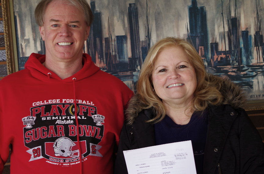 The client, J.L., triumphantly displays a copy of the January 26, 2015 decision of the Fifth District Court of Appeals, standing next to Attorney David K. Greer. The appeals court upheld the